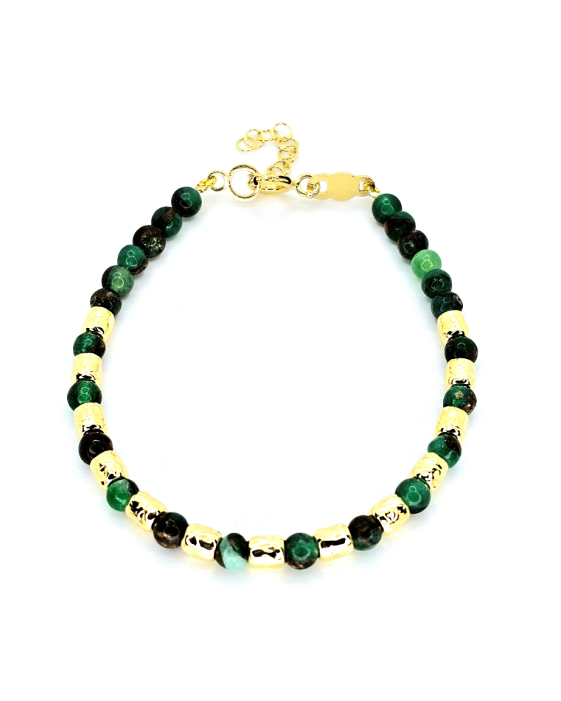 Pulseira 13 tubinhos em prata plaqueada a ouro com contas agatas verdes