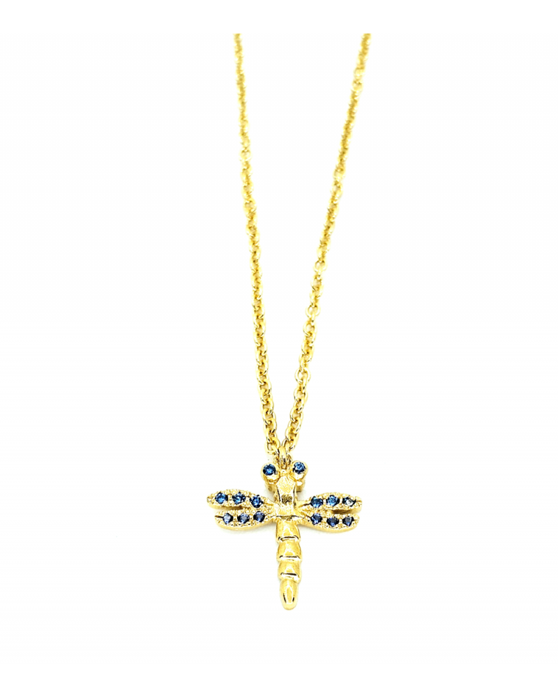 Colar Libelinha prata plaqueado a ouro, com pedras azuis