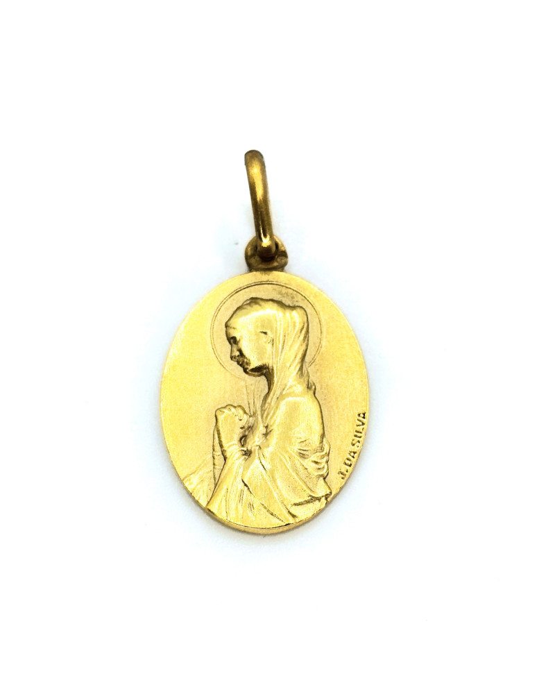 MEDALHA VIRGEM OVAL FLORES PRATA DOURADA